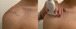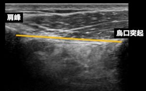 ここではこの鳥口肩峰靭帯の位置と、プローブの置く場所を確認し